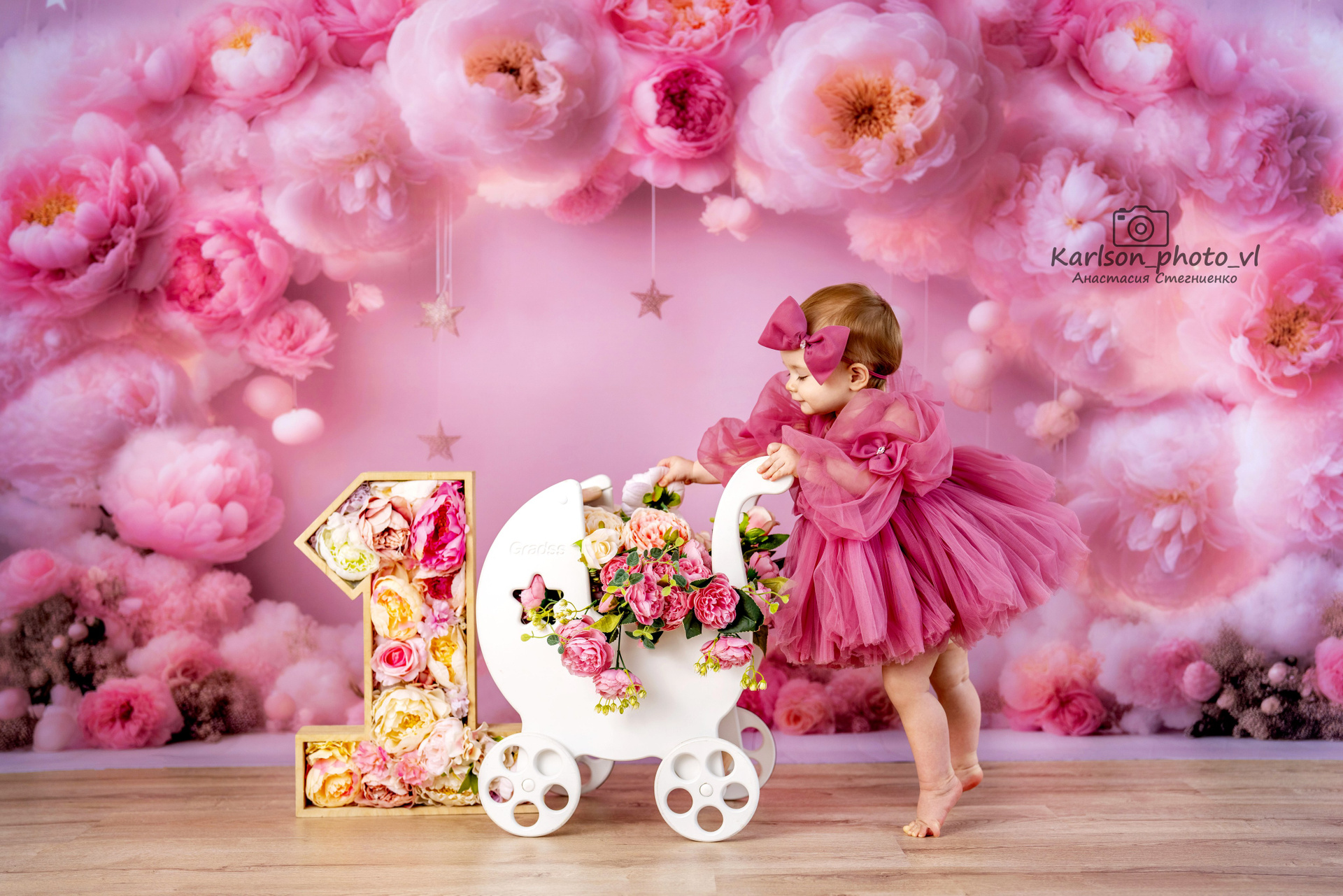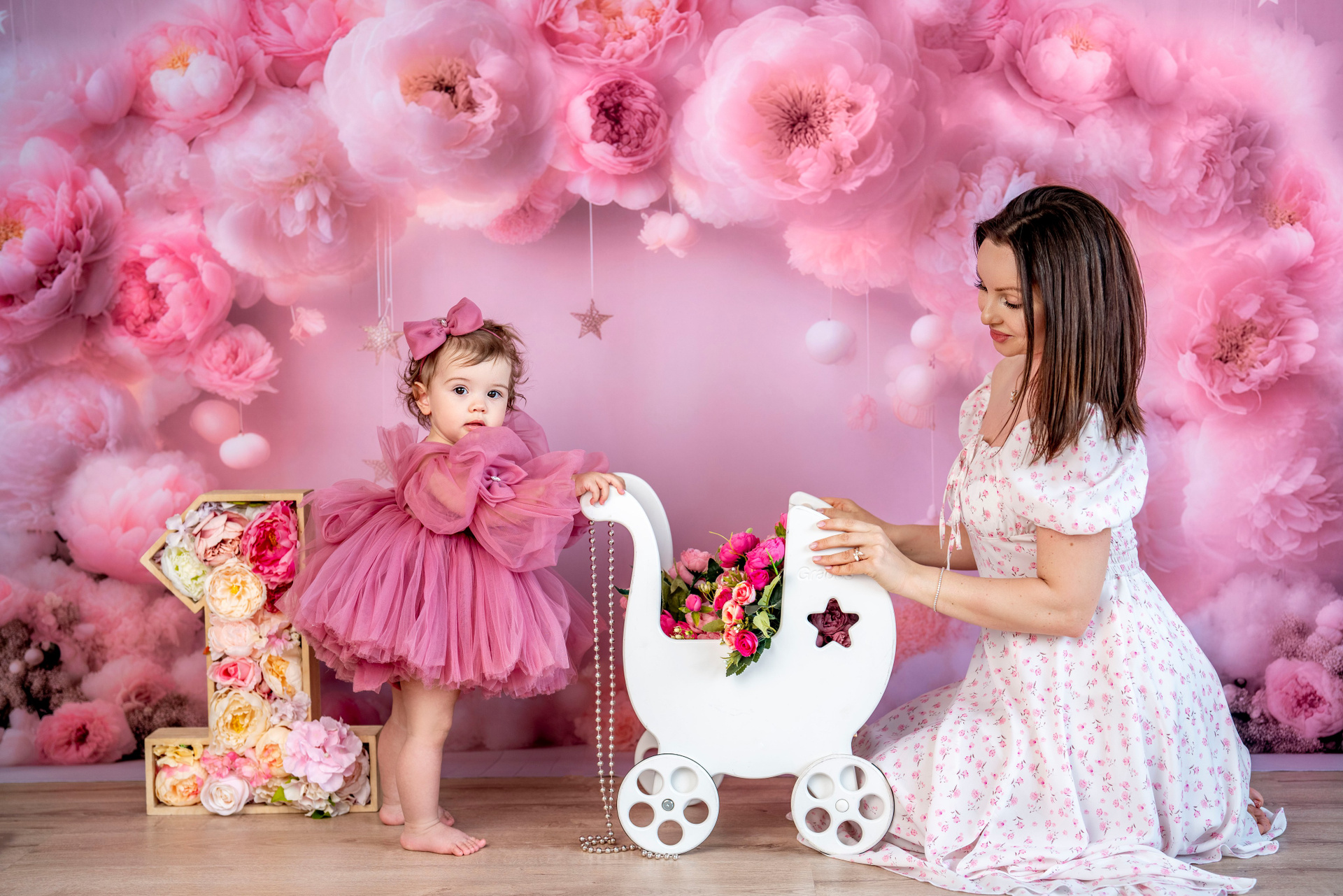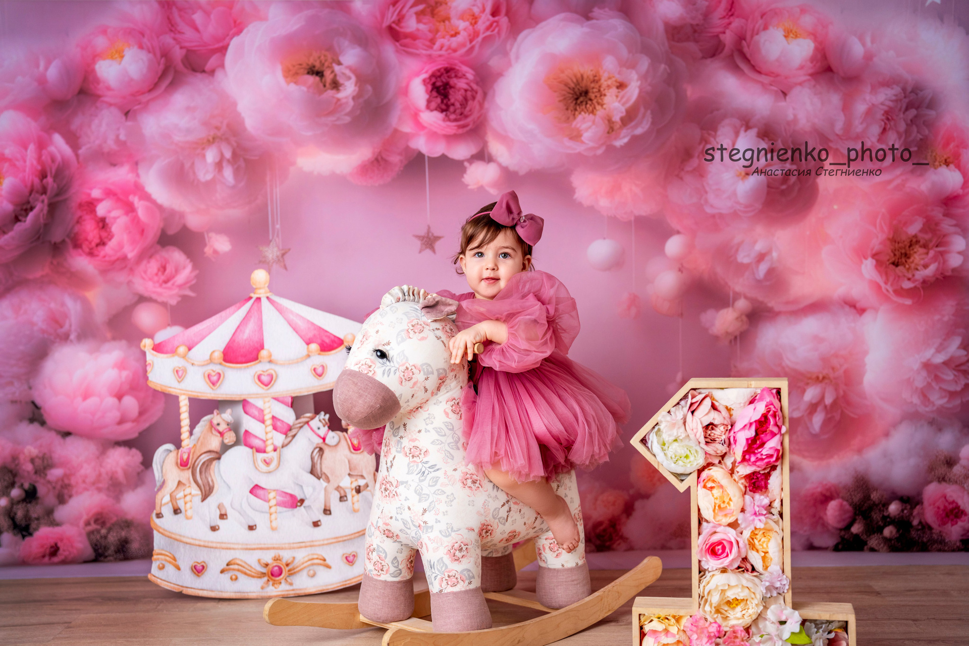Самая цветочная локация с пионами, шикарное платье ручной работы как на фото в наличии, разный реквизит (колясочка, кроватка, лошадка) можно сделать семейные фото сидя (фон невысокий)