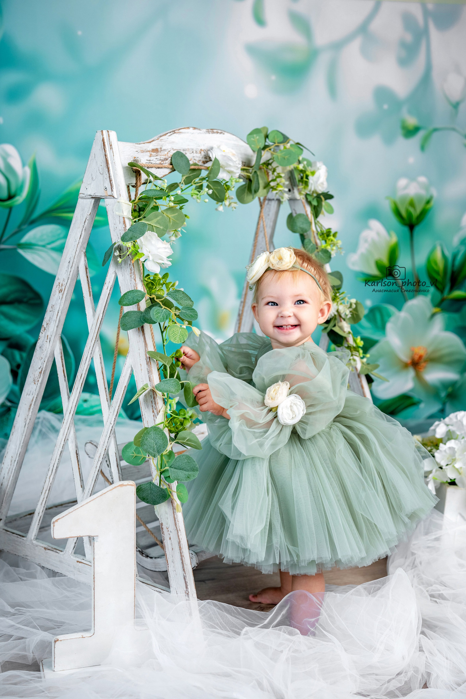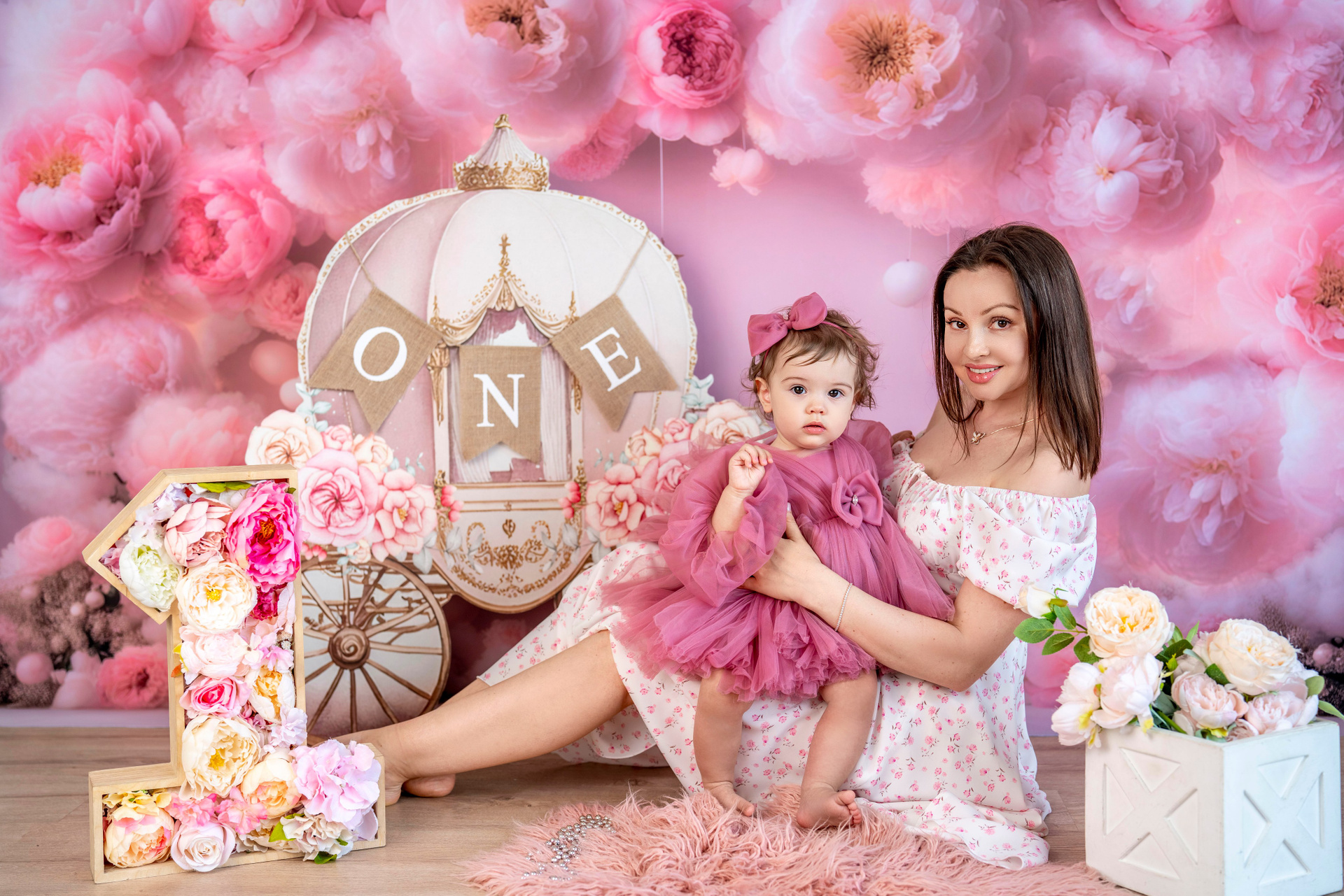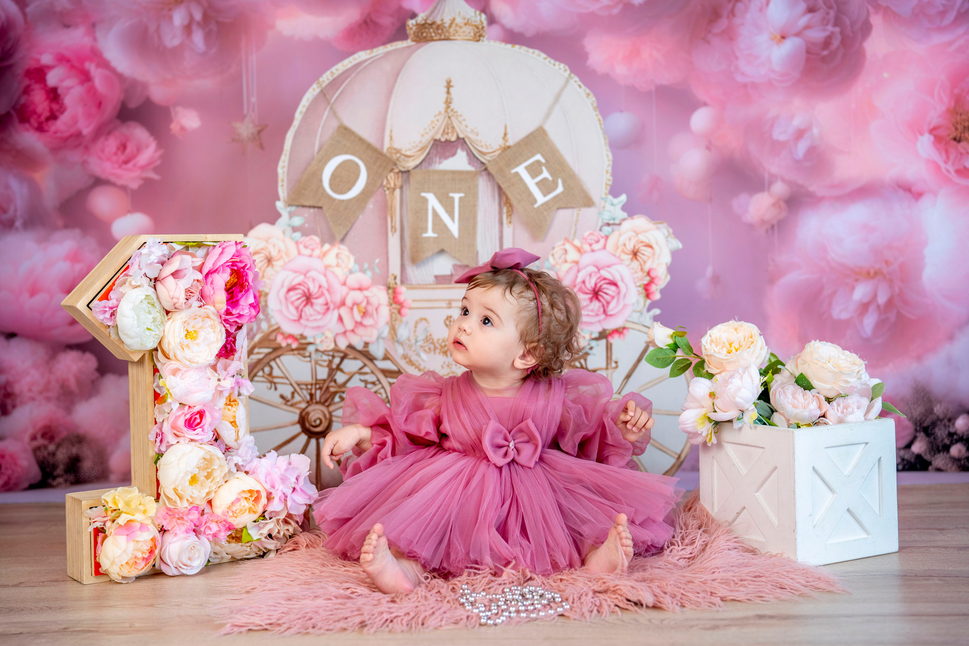 Самая цветочная локация с пионами, шикарное платье ручной работы как на фото в наличии, разный реквизит (колясочка, кроватка, лошадка) можно сделать семейные фото сидя (фон невысокий)